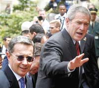 Más tarde, y con un tono menos melodramático, los dos presidentes dieron una conferencia de prensa para dar a conocer los frutos de su reunión. Bush se comprometió a seguir apoyando y ayudando al gobierno colombiano en su lucha contra las guerrillas y el narcotráfico. También prometió hacer todo lo posible para que su Congreso ratifique el TLC, que ambos países firmaron el año pasado pero que todavía no tiene el visto bueno de los Legislativos. El tema que no discutieron en la conferencia de prensa pero sí a puertas cerradas fue la posibilidad de un rescate militar para unos 60 rehenes de las FARC, entre ellos tres contratistas estadounidenses –la guerrilla sostiene que son espías de la CIA–, que fueron secuestrados hace cuatro años. Los familiares de los rehenes y las organizaciones de derechos humanos se niegan a esta opción, a la que consideran muy peligrosa, y piden que el gobierno acepte un canje entre secuestrados y guerrilleros presos.