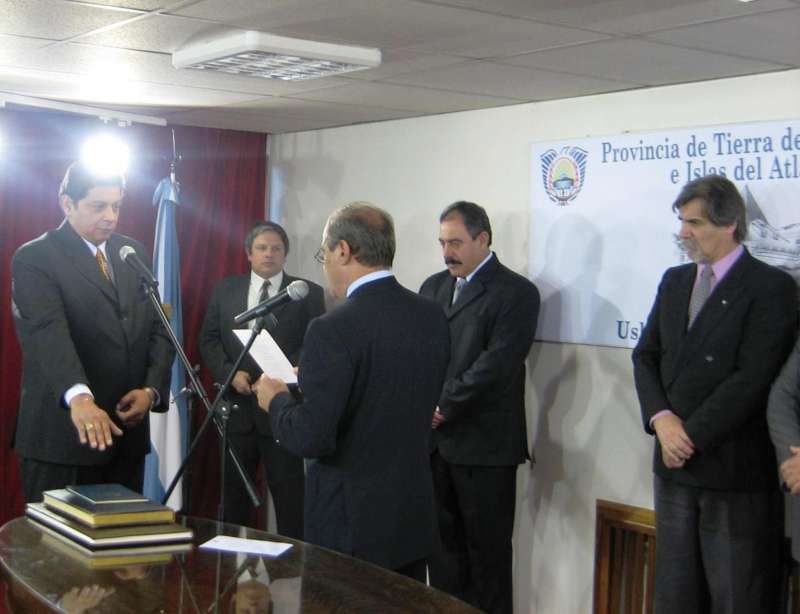 Ushuaia.- En una breve ceremonia llevada a cabo esta tarde en el Salón Blanco de la Casa de Gobierno, el primer mandatario provincial Hugo Cóccaro, tomó juramento formal como nuevo ministro de Salud al Dr. Oscar Ruíz; a Luis Vázquez como subsecretario de Deportes y al secretario de Medios Héctor Cavalotti.