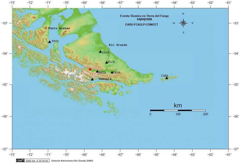 (21:50 hs)-El procesamiento PRELIMINAR realizado en la Estación Astronómica Río Grande con los datos provenientes de la estación DSPA (Ea. Despedida) y la Estación Temporaria Río Grande determinó una magnitud de 3.2 en la escala Richter.