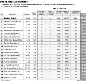 La evolución de esos datos entre mediados y fines del año pasado reafirma a Mendoza como el municipio más próspero del interior del país. Confirma también que los distritos más ricos son los del centro y sur del país, en especial los de la Patagonia y Cuyo, y los del Norte son los más retrasados. La provincia de Buenos Aires es un caso particular: aporta al núcleo de distritos más prósperos y al de más pobres.
