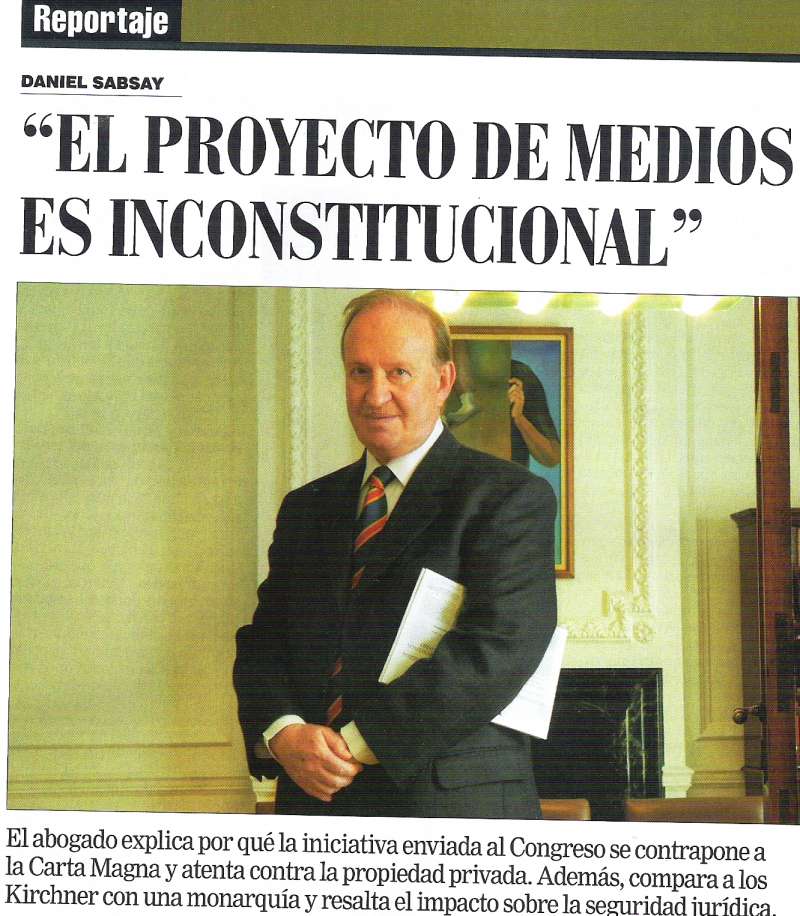 Sabsay: Eso es lo que menos me importa. Desde el punto de vista legal yo analizo cuál es el impacto sobre la libertad de expresión, el federalismo y la seguridad jurídica. De todos los aspectos inconstitucionales de esta ley, muchos están entre los más importantes de un estado de derecho. Lo de Clarín es anecdótico. Con mucha habilidad marketinera, el Gobierno siempre instala sus iniciativas con la imagen de un gran enemigo y bajo un paradigma maniqueo. Si la finalidad es darle mayor amplitud a la libertad de expresión y una democratización en el manejo de las empresas, el proyecto resulta un medio desproporcionado e irrazonable, lo que también es inconstitucional.