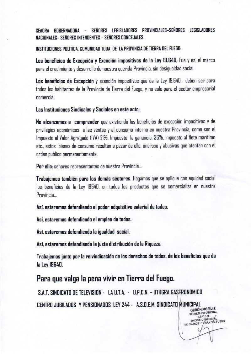 Los beneficios de excepcion y Exención impositivas de la Ley 19640, fue y es el marco para el crecimiento y desarrollo de nuestra querida Provincia, sin desigualdad social. Los beneficios de excepcion y exención impositivos que da la Ley 19640, debe ser para todos los habitantes de la provincia de Tierra del Fuego y no solo para el sector empresarial y comercial.