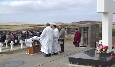 La entrada al cementerio es una tranquera con custodia del comando de fuerzas de las islas, a campo abierto hasta donde la vista permite mirar. Uno de los pocos carteles en castellano recuerda que por el acuerdo alcanzado en 1999 se autorizó a la Comisión de Familiares de los Caídos en Malvinas a “mantener” el cementerio”. Antes de las 11 de la mañana del sábado frío, nuboso, los tres micros que transportan a los 170 familiares estacionaron en el predio. El descenso es lento, ceremonioso, angustiante por el camino de prolijas piedritas marrones y blancas que lleva hasta la entrada a las tumbas. Comienza la ceremonia individual. Cada uno de los familiares busca el nombre conocido, otros deben encontrarlo porque son muchos los que fueron por primera vez a las islas. No todas las tumbas tienen nombre, porque no todos los cuerpos fueron reconocidos. Doscientos cuarenta y siete descansan bajo las lápidas pero sólo 109 tienen nombre. El resto señala que es un “soldado argentino sólo conocido por Dios”. Todas tienen flores artificiales de colores, y rosarios, muchos rosarios blancos, celestes, madera. Miguel Galarza apoya la rodilla en el suelo terroso para iniciar un diálogo silencioso con su hijo José Luis. Todos se pasean entre los recuerdos de una tragedia en un territorio bajo dominio británico.