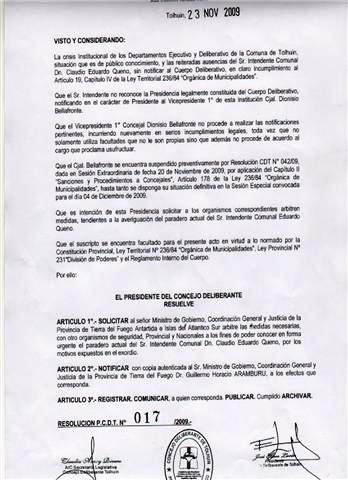 Los vecinos de Tolhuin con un notorio malestar por las permanentes desapariciones del intendente Claudio Queno sin notificar al concejo deliberante cargo para el que fue electo, pero además por dejar al frente del ejecutivo a un concejal, procesado y suspendido por resolución CDT Nº 042/09 dada en sesión extraordinaria el dia 20 de este mes.