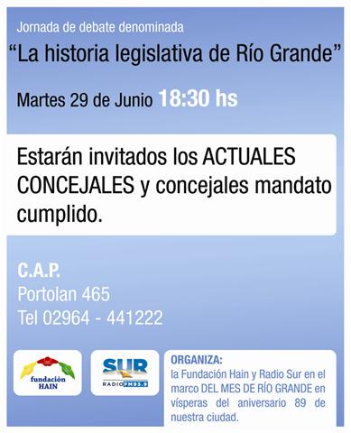 RIO GRANDE.- A partir de las 18.30 horas del martes y con motivo por los festejos por el 89° aniversario de la ciudad de Río Grande, FM Sur y fundación Hain, realizarán una jornada debate, la cual fue llamada “La Historia Legislativa de Río Grande”. El mismo contará con la presencia de los actuales concejales de la ciudad de Río Grande y ediles de mandato cumplido a lo largo de todos los períodos legislativos.