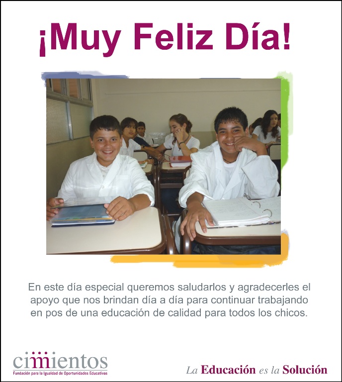 En este dia tan especial queremos saludarlos y agradecerles el apoyo que nos brindan dia a dia para continuar trabajando en pos de una educación de calidad para todos los chicos. Fundación Cimientos.