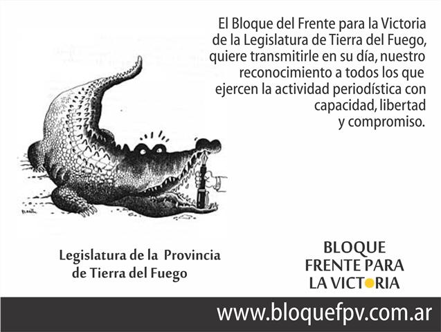 El bloque del Frente para la Victoria quiere transmitirle en su dia, nuestro reconocimiento a todos los que ejercen su actividad periodística con capacidad libertad y compromiso. Bloque de legisladores del Frente para la Victoria de la Legislatura de Tierra del Fuego.