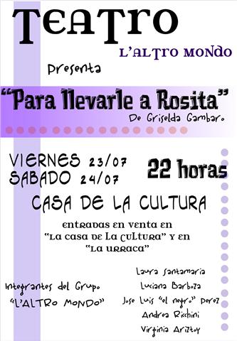 El grupo teatral L´alto Mondo Presenta la obra de Griselda Gambar “Para llevarle a Rosita”. La presentación se llevara a cabo el viernes 23 y sábado 24 de agosto en la Casa de la Cultura de Rio Grande. Las entradas están en venta en al Casa de la Cultura y en “La Urraca” El grupo esta integrado por Laura Santamaría, Liliana Barboza, Jose Luis “Negro” Perez, Andrea Richini y Virginia Ariztoy.