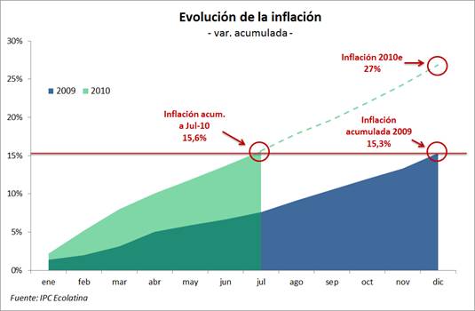 Según nuestros relevamientos en sólo siete meses la inflación acumula 15,6%, superando la suba registrada en todo 2009. Más aún, el incremento del IPC Ecolatina registrado a julio es similar al observado en el mismo período de 2008 cuando el conflicto con el campo exacerbó la suba de precios de los alimentos.