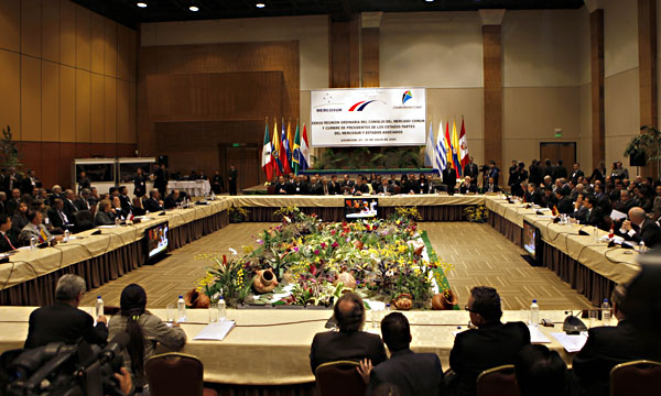 De la cumbre, que se desarrollará en el Centro Cívico de San Juan, participan los cuatro presidentes del bloque (Argentina, Uruguay, Paraguay y Brasil), los dos asociados (Chile y Bolivia) y el mandatario venezolano, Hugo Chávez, quien está en proceso de adhesión como miembro pleno.