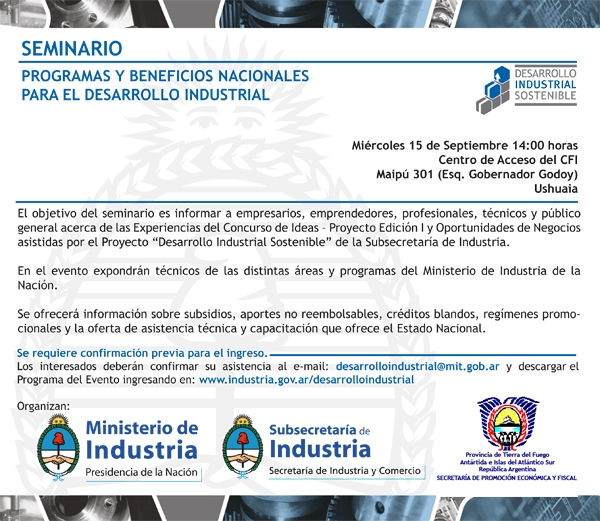 El seminario tendrá lugar en instalaciones del Consejo Federal de Inversiones, Maipú 301 Ushuaia, a partir de las 14. La entrada es libre y se solicita confirmar previamente la asistencia al correo electrónico desarrolloindustrial@mit.gob.ar. El programa podrá ser descargado desde el sitio www.industria.gov.ar/desarrolloindustrial.
