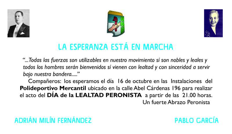 Sab 9 19:01 hs.-Adrian Milin Fernandez y Pablo Garcia referentes del renovarismo peronista invitan a la conmemoracion del Dia de la Lealtad Peronista que se realizará en el Polideportivo Mercantil ubicado en la Calle Abel Cardenas 196 de la Ciudad de Ushuaia, el dia 16 de Octubre a las 21 hs.
