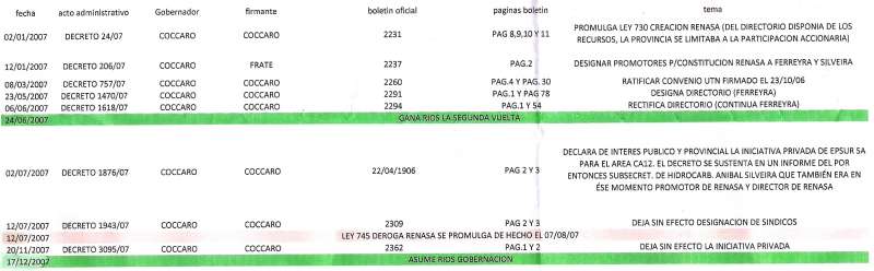 Llega Hugo Coccaro a la gobernación y reflota el tema RENASA y nombra en el directorio a Mario Ferreyra, es decir quienes opinan en contrario participaron en una u otra medida de entregas que no tenían nada que ver con el estado, sino con sociedades anónimas, de estas acciones al asumir Rios la gestión de gobierno no había nada en general y nada en particular sobre el CA12, por lo que la pregunta obvia es ¿Cómo IBAN A ENTREGAR ESTAS AREAS SI NO HABIA NINGUNA INFORMACION?, no había información para ver que posibilidades había para entregar un área que sumada toda es de 4000 kilómetros cuadrados, es decir lo mismo que todas las áreas que hoy se encuentra en explotación, y se iba a consesionar entera.