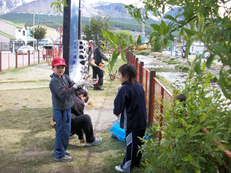 Mart 30 16:50 hs.-Los niños de segundo año, turno mañana y tarde, junto a los docentes y padres, con la colaboración de personal de la Municipalidad de Ushuaia, trabajan en la recuperación de un sector del arroyo Buena Esperanza.