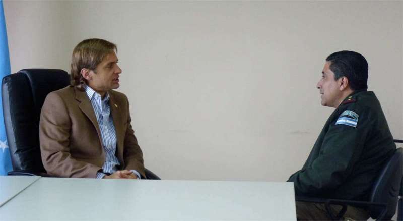 Mart 14 16:50 hs.-El encuentro tuvo lugar hoy al mediodía en el edificio municipal “Adolfo Cano”, ubicado en la calle Arturo Coronado 485. La reunión entre el intendente Federico Sciurano y el jefe del Escuadrón 44 de Gendarmería Nacional, comandante principal José Manuel Moreno, se llevó a cabo en la sala ubicada en el segundo piso del edificio municipal.