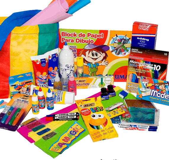 El kit escolar estará compuesto por 21 artículos de librería y papelería de primeras marcas, tales como bolígrafos, lapiceras, lápices de colores, fibras, lápiz corrector, cuadernos, cartucheras, carpetas, mochilas, hojas de repuesto, adhesivos vinílicos, tijeras, sacapuntas, gomas de borrar, marcadores, etc.