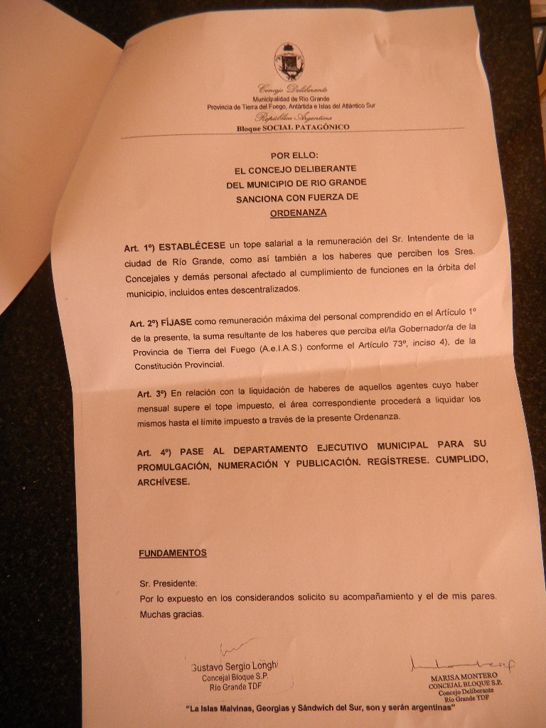 Mierc 1° 12:11 hs.-El bloque del partido Social Patagónico presentó este martes un proyecto de ordenanza mediante el cual impone un tope salarial al intendente de la ciudad de Rio Grande, los concejales y demás personal afectado al cumplimiento de funciones en la orbita municipal, incluidos entes descentralizados. La idea es que nadie puede cobrar mas que la gobernadora. El proyecto lleva las firma de Longui y Montero.