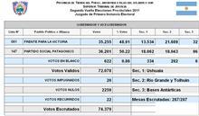 La fórmula que integran la gobernadora Fabiana Ríos y Roberto Crocianelli se impuso por un 50,22% ante la dupla del Frente para la Victoria conformada por Rosana Bertone y Marín Pérez, quienes obtuvieron un 48,91% de los sufragios.