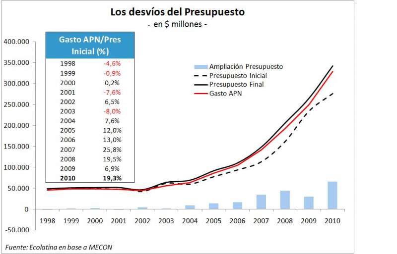 De hecho, la brecha entre los gastos estipulados en el presupuesto y los efectivamente devengados no sólo es creciente en monto, sino también en porcentaje: en 2004-2006 las erogaciones de la APN fueron 11% superiores a la meta, mientras que en 2007, 2008 y 2010 este ratio se duplicó. En 2009, el gasto final terminó siendo “apenas” 7% superior, principalmente por el impacto de la crisis financiera internacional sobre la recaudación prevista.