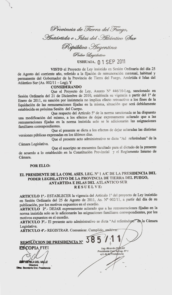 Viern 2 07:46 hs.-Se emitió en las últimas horas de hoy, la Resolución de Presidencia Nº 385/11 suscripta por el Legislador Ricardo Furlan –a cargo del Poder Legislativo-, donde se establece la “vigencia del articulo 1º del proyecto de Ley insistido en Sesión Ordinaria del 25 de agosto de 2011, As. Nº 002/11, a partir del día de su publicación”, según se desprende del documento.