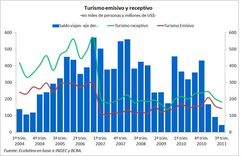 Los datos disponibles a noviembre de 2011 de la Encuesta de Turismo Internacional que realiza el Indec confirman que el turismo emisivo fue mucho más dinámico que el receptivo. En efecto, en los primeros once meses del año pasado el arribo de turistas extranjeros al país creció sólo 2% i.a., mientras que las visitas de los argentinos al exterior treparon 13,3% i.a.