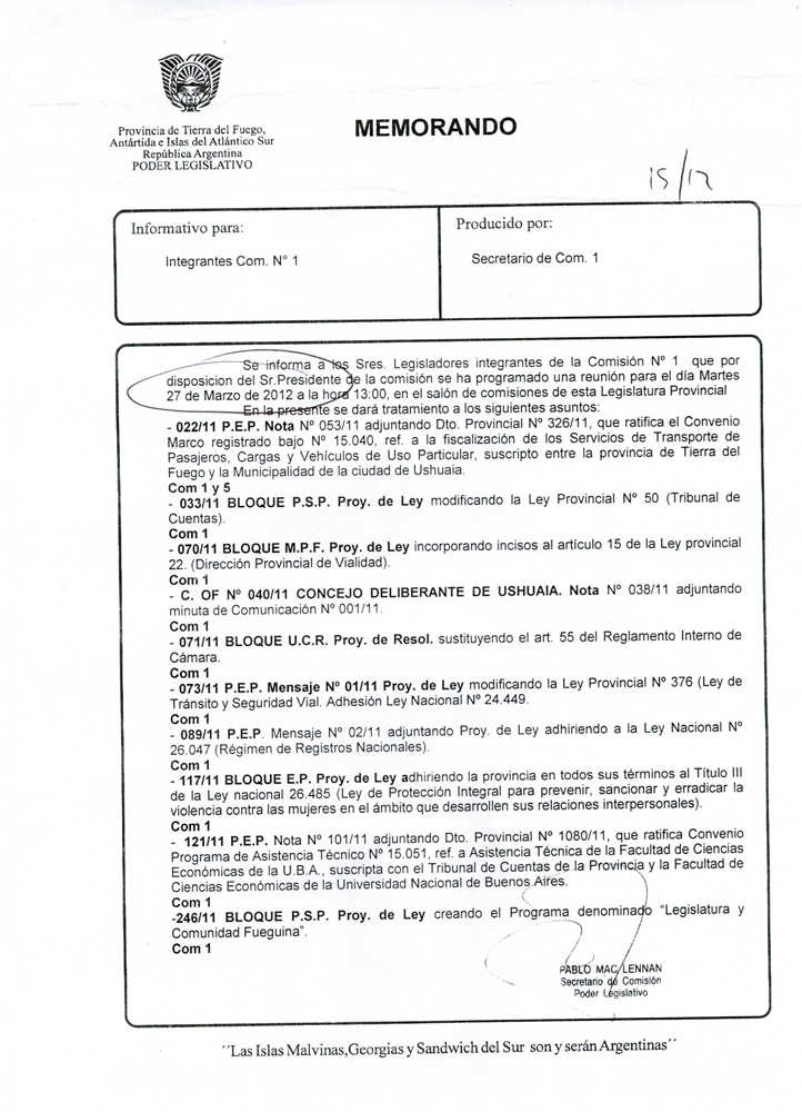 Se reunirá el martes 27 a las 13 en el Salón de Comisiones del edificio de los bloques políticos y se espera avanzar en una serie de temas, listados en el Memorando Interno de la Dirección de Comisiones. Se destacan: Asunto Nº 033/11 PSP Modificando la Ley Provincial Nº 50 (Tribunal de Cuentas); 070/11 MPF Modificando la Ley Provincial Nº 22 (Dirección Provincial de Vialidad); 071/11 UCR Modificando el Reglamento Interno de la Cámara, entre otros. Se adjunta facsímil para su conocimiento.