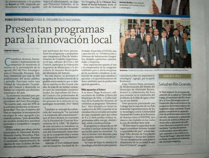 Dom 22 21:42 hs.-El matutino Clarín destacó la presentación de programas para la innovación local en el marco del Foro Estratégico para el Desarrollo Nacional. El artículo destaca la foto donde aparecen en primera plana la presidenta de este Foro, doctora Norma Cadoppi junto al contador Paulino Rossi –Secretario de Gobierno del Municipio de Río Grande y Julio Bogado –Delegado del Municipio en Buenos Aires-.