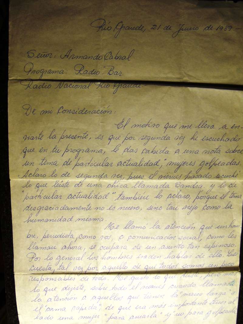 El motivo que me lleva a enviarle la presente es que por segunda vez he escuchado que en tu programa, le das cabida a una nota sobre un tema de particular actualidad, «Mujeres Golpeadas».