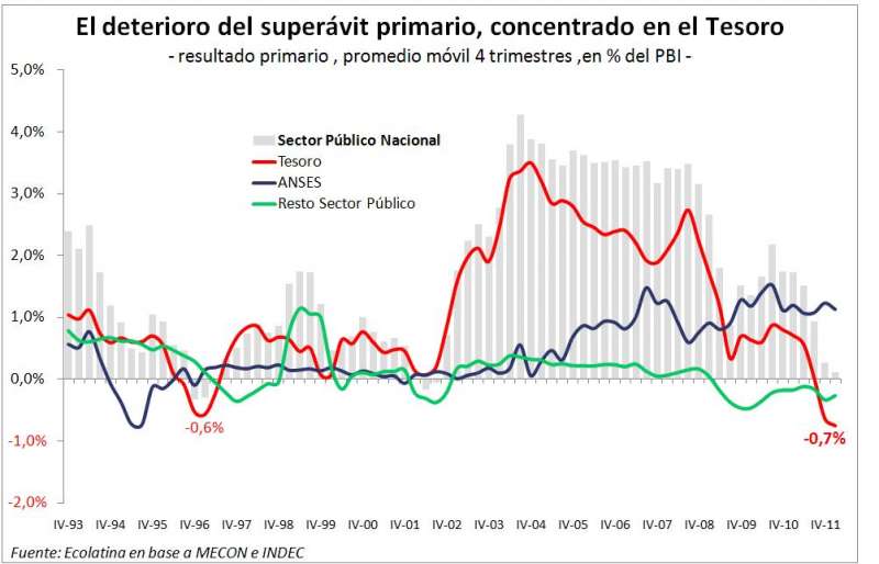 Por el mayor dinamismo de los egresos, el superávit primario nacional de los últimos doce meses se ubicó en 0,1% del PBI, el menor nivel desde fines de 2002. El deterioro estuvo centrado en el Tesoro (-0,7% del PBI), que presentó el mayor déficit antes del pago de intereses de las últimas dos décadas.