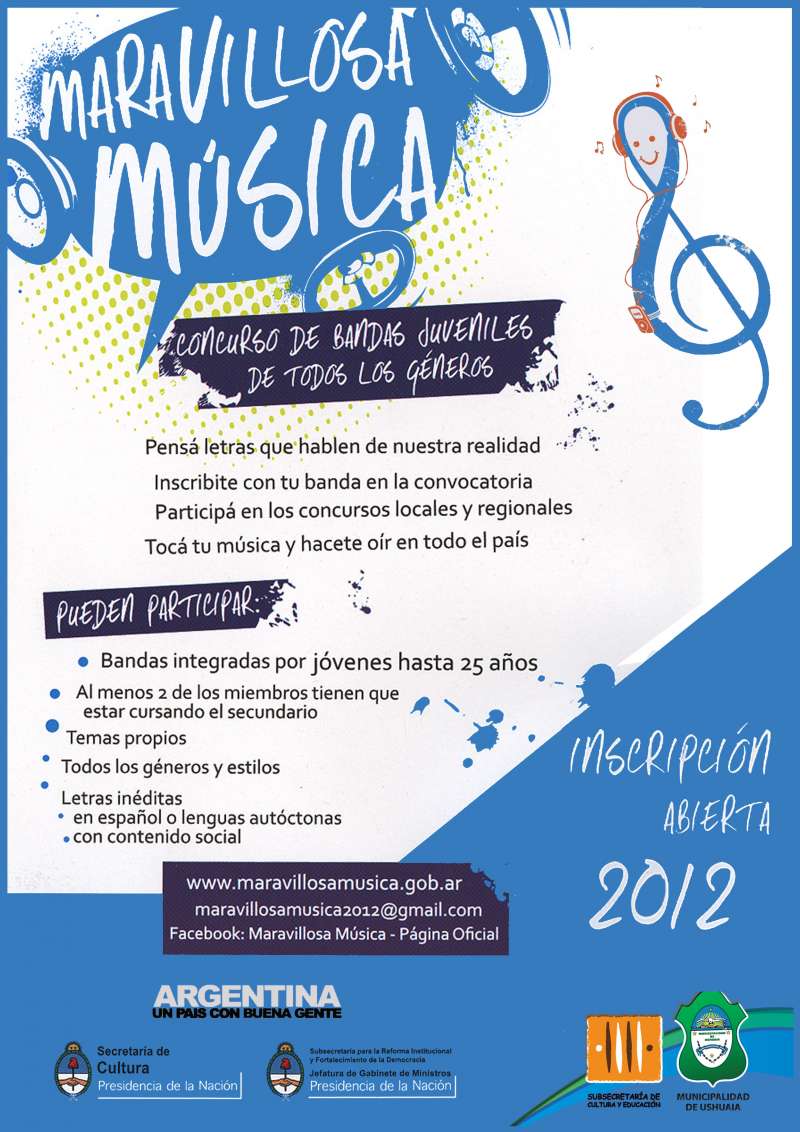 La inscripción se puede realizar mediante la página web www.maravillosamusica.com.ar o acercarse a cualquier dependencia de la Subsecretaría de Cultura de la Municipalidad de Ushuaia para retirar las planillas de inscripción.
