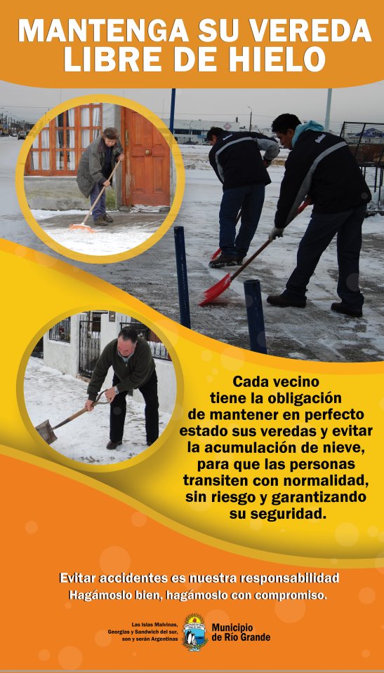 Lun 16 19:16 hs.-A pesar de que existe una ordenanza en vigencia desde 1984 que obliga a todos los vecinos de la ciudad a mantener su veredas limpias de hielo, la realidad marca que el 75% no lo hace aun a pesar de la norma en existente y de las recomendaciones que se hacen a diario a través de los medios.