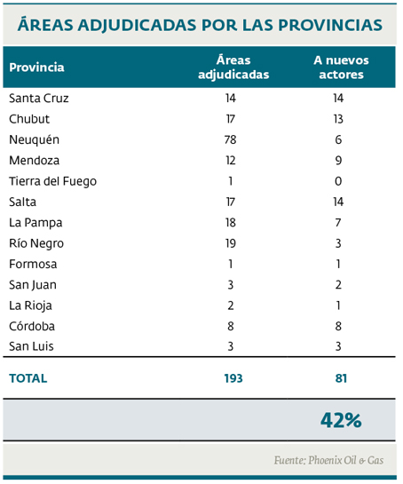Del total de áreas exploratorias adjudicadas, 81 de ellas (el 42%) les fueron otorgadas a nuevos actores de la industria. Y de los compromisos de inversión, un 44% (u$s 882,5 millones) fue ofrecido por estas nuevas firmas. “Si bien este escenario es auspicioso y muestra un fuerte incremento de la actividad exploratoria, demasiadas áreas fueron otorgadas a empresas sin experiencia o con dificultades para acceder al financiamiento de inversiones de riesgo elevadas (según sus propias ofertas)”, señala.