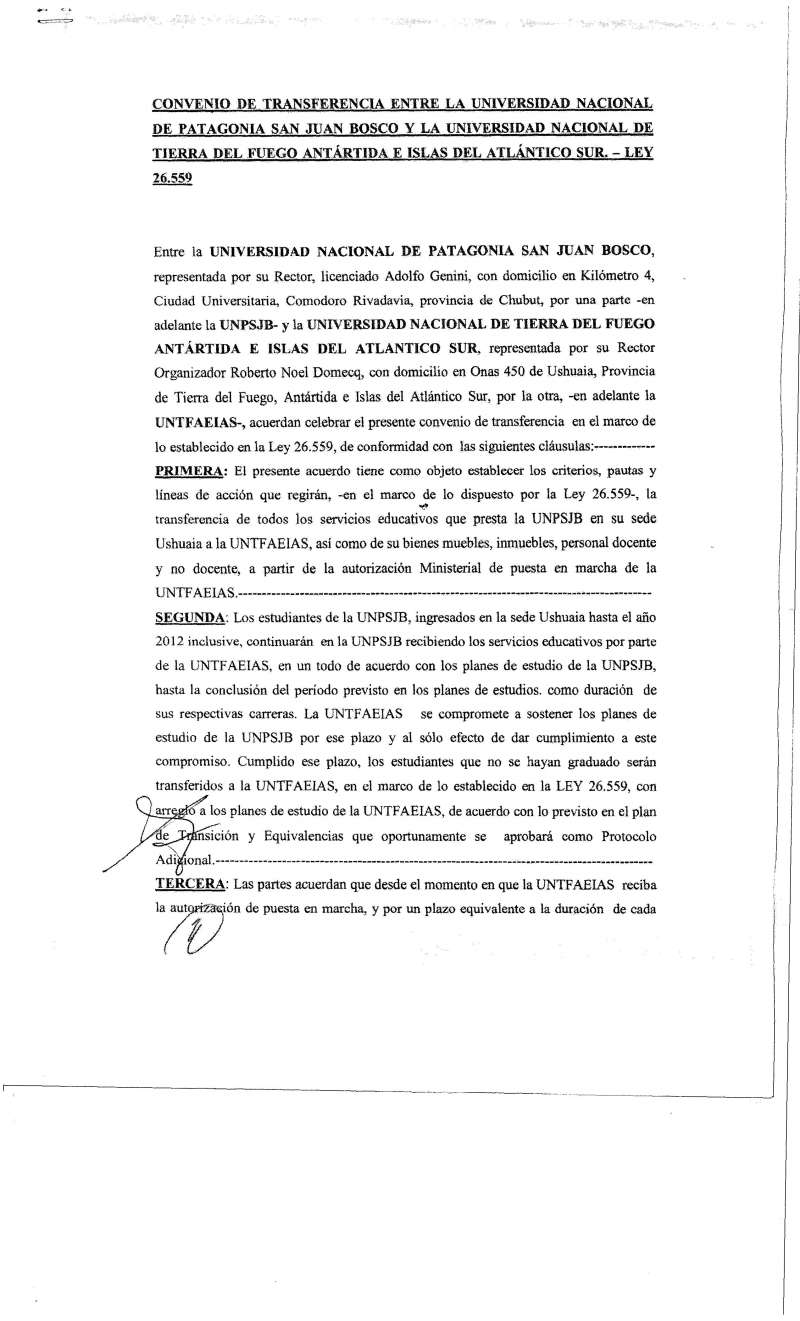 Mierc 8 13:05 hs.-Ante dudas surgidas respecto de la pertenencia de los estudiantes de la Universidad San Juan Bosco, cumplimos en enviarles una copia del acta de traspaso donde se aclara esta situación. Quiero agregar además, que la propuesta de la UNTDF fue que los estudiantes fueran traspasados a la misma, pero el Ministerio de Educación decidió, teniendo en cuenta los derechos adquiridos de los estudiantes, y lo resuelto con los estudiantes en otras universidades en situaciones similares, que debían continuar perteneciendo al alumnado de la San Juan Bosco.