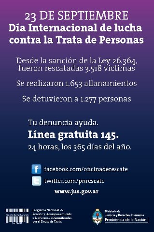 Viern 21 21:39 hs.-El próximo domingo se conmemora el Día Internacional de la lucha contra la Trata de personas. Por tal motivo el Programa Nacional de Rescate a Personas Damnificadas por el Delito de Trata te invita a una jornada de sensibilización en Tecnópolis Argentina (de 14 a 18hs) y te cuenta que se lanzará una nueva campaña nacional de difusión de la línea gratuita de denuncia 145.