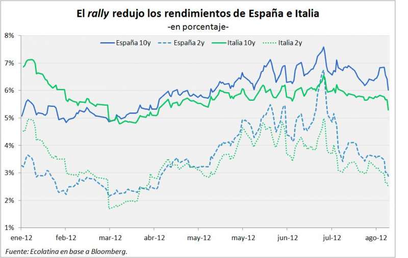 Más importante aún, los rendimientos de los bonos españoles e italianos se redujeron significativamente, en particular en el tramo corto de la curva: del 6% que habían tocado a fines de julio bajaron a cerca de 2,6% en la actualidad.