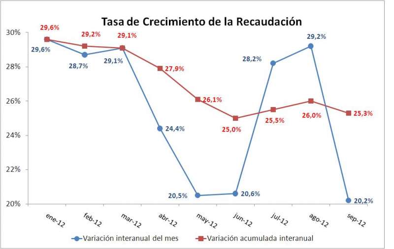 Sin embargo a diferencia de lo acontecido en los últimos años, en los primeros nueve meses de 2012 la tasa de crecimiento acumulada (25.3%) de los ingresos tributarios se ubica por debajo del ritmo de expansión nominal (crecimiento + aumento de precios) de la economía