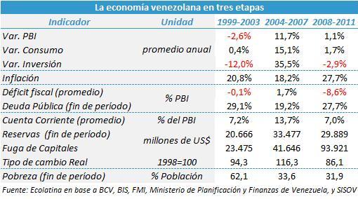 Durante la gestión de Chávez la economía venezolana aceleró su tasa de crecimiento promedio anual de 2% en 1970-1998 a 3,2% por año en 1999-2011. De todas formas, estuvo por debajo de la performance de Sudamérica en los últimos doce años (+4,0%).