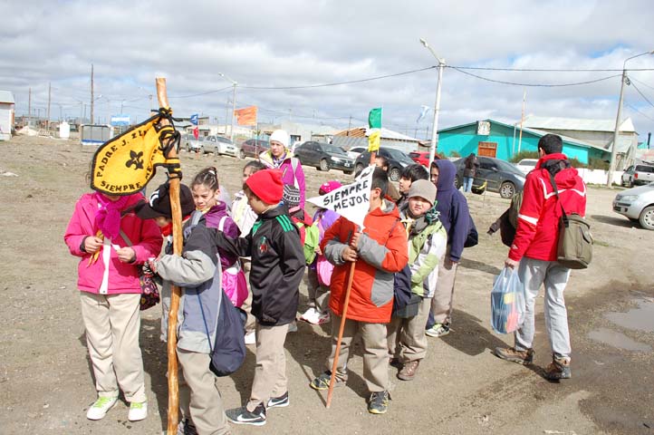 Los scouts improvisaron un mástil con troncos de madera y cuerdas y realizaron el izamiento del Pabellón nacional.