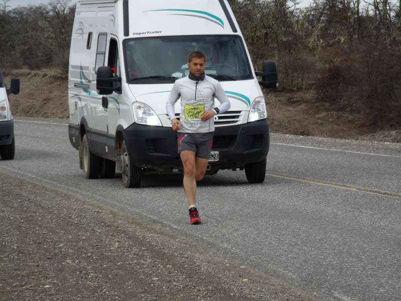 Sciurano se propuso unir Ushuaia y Rio Grande en 7 días y como lo muestran las fotografías sigue con su cometido acompañado de un equipo que lo apuntala, integrado por una ambulancia, su nutricionista, preparador físico, y varios vehículos que siguen al intendente.