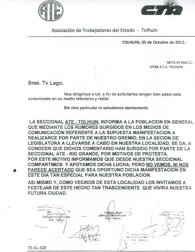 TOLHUIN, 8 de octubre 07:30 hs.- La Seccional Tolhuin de la Asociación de Trabajadores del Estado, deslindaron su responsabilidad de los incidentes generados por un grupo de manifestantes que respondían al secretario general de ATE Río Grande Marcelo Córdoba, en la sesión legislativa del último viernes donde se aprobó el proyecto de Ley de municipalización de la localidad centro de la Isla.