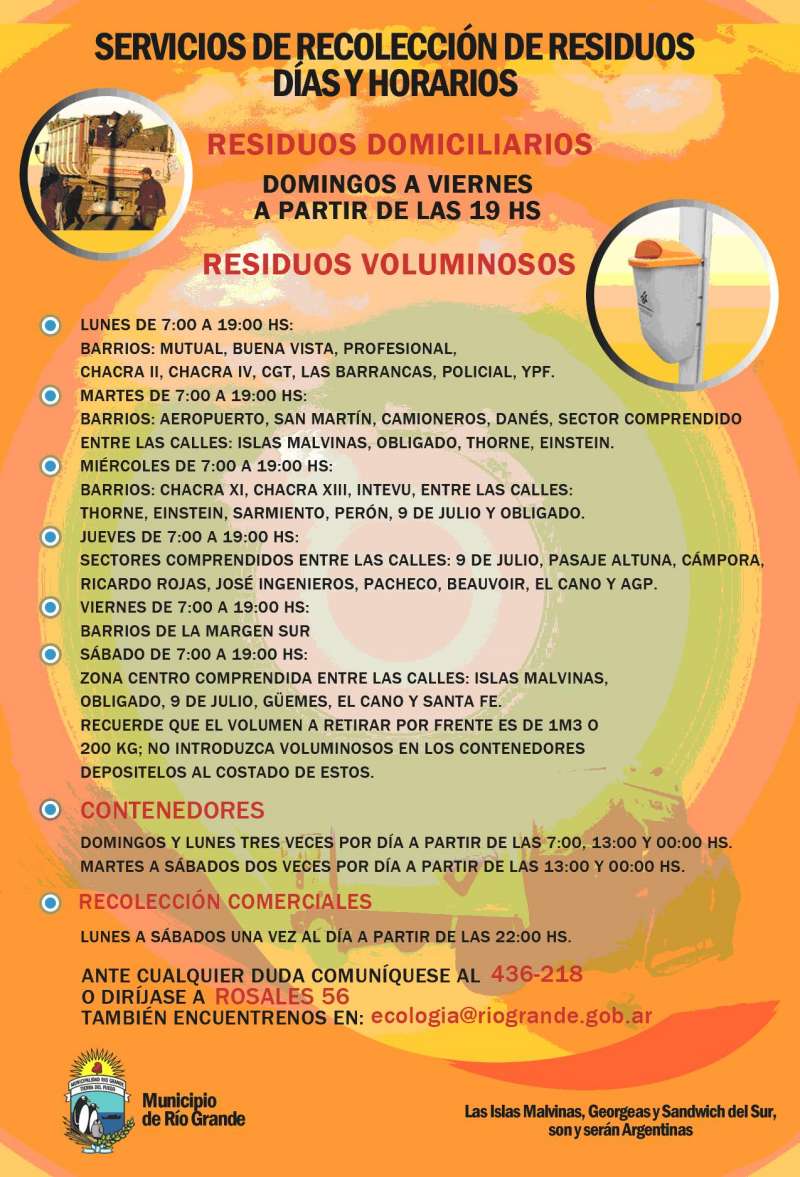 En el caso de los residuos voluminosos, el Municipio recuerda a los vecinos que se está prestando el servicio con un cronograma establecido y en caso de tener que utilizarlo, acondicionen estos desperdicios en los días y horarios prefijados para cada sector de la ciudad y que a continuación se detalla: