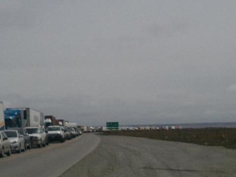 Lun 16/11/12 16:33 hs.- La fotografía muestra lo que veníamos adelantando respecto de como será la salida de los fueguinos hacia el continente en las próximas vacaciones. Una interminable cola de kilómetros de longitud para poder reingresar a la provincia y lo mismo ocurrió el viernes con las salidas.