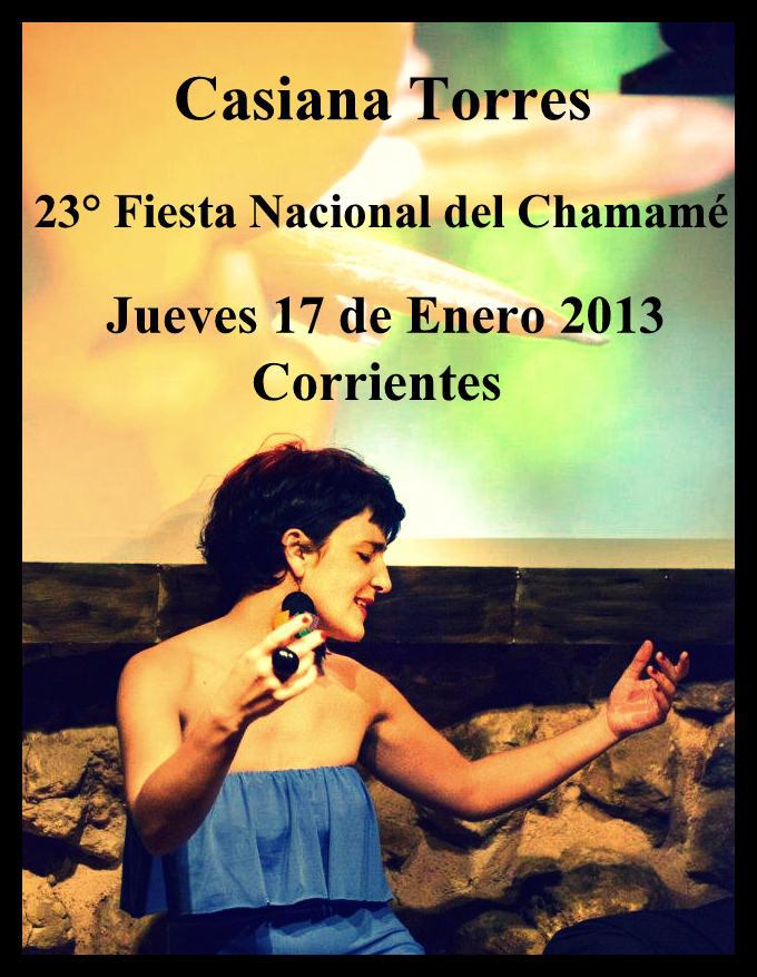 Mart 08/01/13 19:54 hs.-La cantante fueguina Casiana Torres arrancará su temporada de festivales el jueves 17 de enero, cuando pise el escenario Osvaldo Sosa Cordero de la 23º Fiesta Nacional del Chamamé y 9ª del Mercosur que organiza el Gobierno de Corrientes, a través del Instituto Provincial de Cultura.