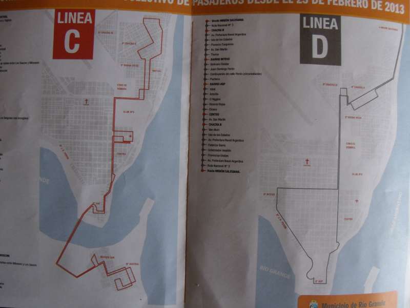 Juev 21/02/13 12:28 hs.-La municipalidad de Rio Grande esta distribuyendo folleteria que contiene los nuevos recorridos de las cuatro lineas de colectivos que funcionan en la ciudad. A,B,C yD, los mismos se llevaran a cabo a partir del día 23. En las fotografías se muestran los nuevos recorridos.