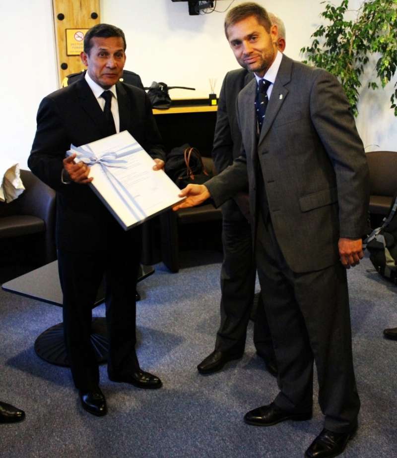 Durante el encuentro protocolar Ollanta Humala fue declarado Huésped Ilustre de la ciudad por el Intendente de Ushuaia, Federico Sciurano, quien tuvo palabras de agradecimiento por la posición inclaudicable del Perú con la causa Malvinas. El intendente resaltó la importancia para la ciudad del país Latinoamericano, destacando la inauguración en su homenaje de la Plaza Perú durante el 2012.