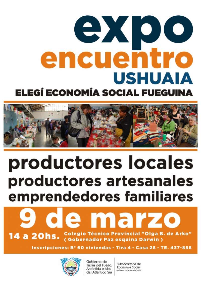 Ushuaia, 4/03/13 17:58 hs.-El Ministerio de Desarrollo Social, a través de la Subsecretaría de Economía Social organiza para este sábado 9 de marzo, la primer Expo Encuentro del 2013 “Elegí Economía Social Fueguina” en el Gimnasio del Colegio Técnico Provincial Olga B. de Arko, sito en Gob. Paz esq. Darwin de esta ciudad.