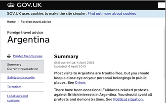 Juev 04/04/13 14:33 hs.-A través de un comunicado de prensa difundido por la cancillería, Gran Bretaña advierte a los turistas que viajen a la Argentina sobre la inseguridad del país. Recomiendan «vigilar» las pertenencias sobre todo en espacios públicos.
