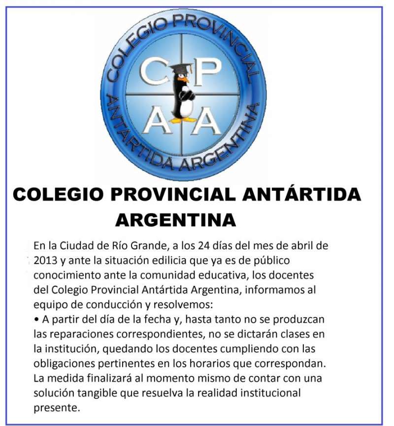 Juev 25/04/13 15:40 hs.- A través de un comunicado el Colegio Antártida Argentina informó que no se dictaran clases hasta nuevo aviso, a raíz de la catarata de problemas edilicios que se presentan al momento de esta nota.. Los docentes cumplirán con sus obligaciones habituales en los horarios que correspondan.