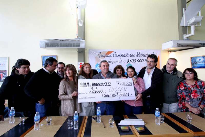 En el comedor del Edificio Cano los dirigentes gremiales y trabajadores en general, entregaron al presidente de Lucha Contra el Cáncer Ushuaia, Omar De Luca, un cheque simbólico por 100.000 pesos.
