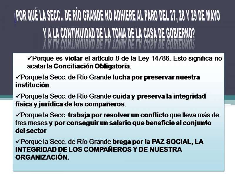 En cuanto a las razones por las que no adhiere al paro decretado por la dirigencia provincial del gremio, desde Rio Grande señalan que esta es una herramienta para exigirle a la patronal un espacio de negociación para finalizar el conflicto y es un logro que conquisto el sindicato luego de tres meses de lucha que permite conciliar entre las partes.